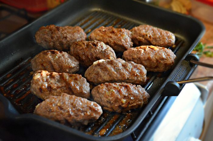 Обрежьте горлышко у пластиковой бутылки, оно понадобится для формовки чевапчичей. Фарш еще раз перемешайте руками, наполните горлышко бутылки фаршем и, проталкивая его через отверстие, «отсадите» колбаски на разделочную доску.
