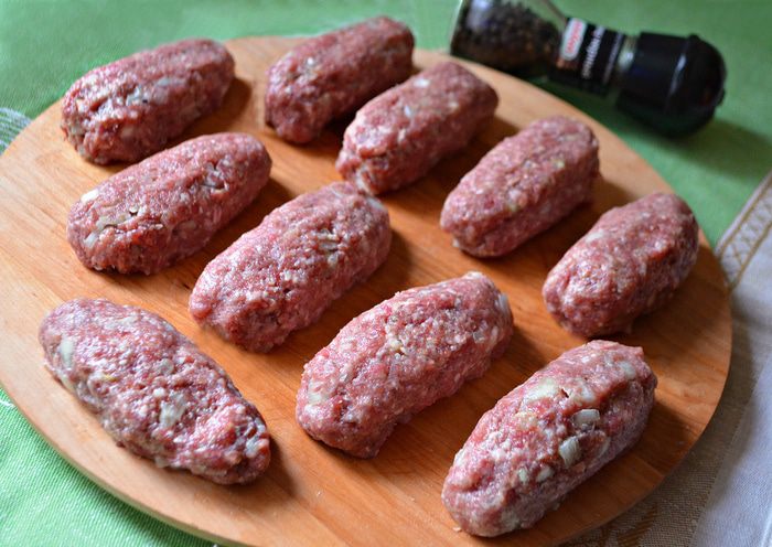 Колбаски можно скатать и руками (в этот раз я так и сделала), но проходя через горлышко бутылки, фарш дополнительно уплотняется, и изделия получаются ровные, одинакового размера (5-7 см).