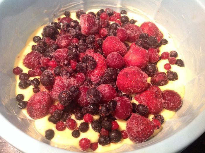 Форму смажьте маслом, вылейте тесто, сверху выложите ягоды (у меня замороженные). Готовьте в духовке при 180 градусах 30-35 минут. Готовность проверьте зубочисткой.