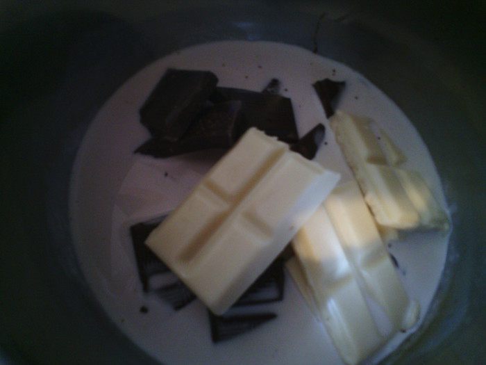 Подогреть сливки, добавить поломанный шоколад и сироп, все хорошо перемешать. Начинаем сборку.