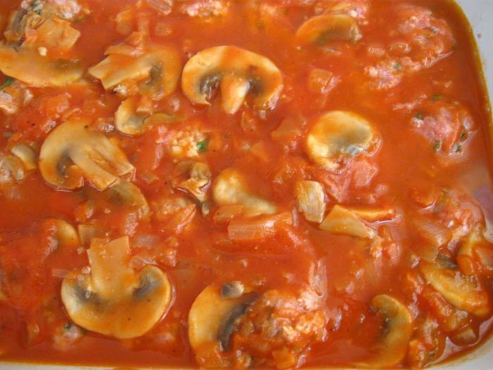 Приготовить соус. Обжарить лук до прозрачности на сковороде с добавлением оливкового масла, добавить чеснок, пропущенный через пресс, налить вино, несколько минут потушить, затем положить грибы, посолить, поперчить и через 1-2 минуты добавить пассированные томаты и томатную пасту. Мясным (овощным) бульоном отрегулировать консистенцию, подержать на небольшом огне, помешивая, несколько минут. Соуса должно быть много, чтобы он покрывал мясные шарики полностью.
