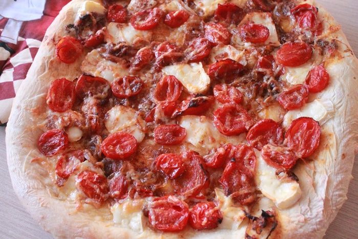 Возьмите большой противень или круглую большую форму. Выложите пекарской бумагой и растяните тесто руками придав круглую форму лепешке. Сверху выложите сыр и залейте соусом.