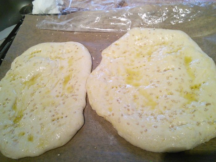 Разделите на 4 части. Скатайте в шарики и оставьте по плёнкой на 15 мин отдохнуть. Теперь шарик рукой немного его распластайте, чтобы он превратился в плоский круг, поворачивайте его в воздухе как руль в одном направлении по кругу кусочек за кусочком. Не тяните, достаточно силы тяжести самого теста. У вас должен получиться лаваш примерно 0,5 см высотой. Рант в этом случае получается немного утолщенным.
