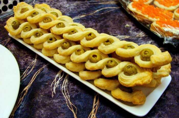 Взять две полоски, слепить концы и, вставляя оливки, заплести косичку (жгут).