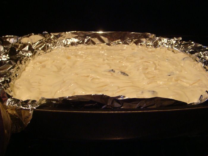 Творог перемешать погружным блендером до кремообразной консистенции+желтки+ сл.масло (растопленное)+муку, перемешать +вермишель+изюм+соду+ванилин перемешать.