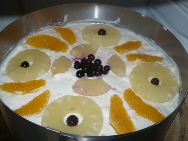 Заливаем фруктовым желе верх и ставим в холодильник для полного застывания всего торта. Потом снимаем кольцо и готово. Я делала 2 торта сразу, поэтому здесь фрукты немного по другому разложены, а принцип тот же.