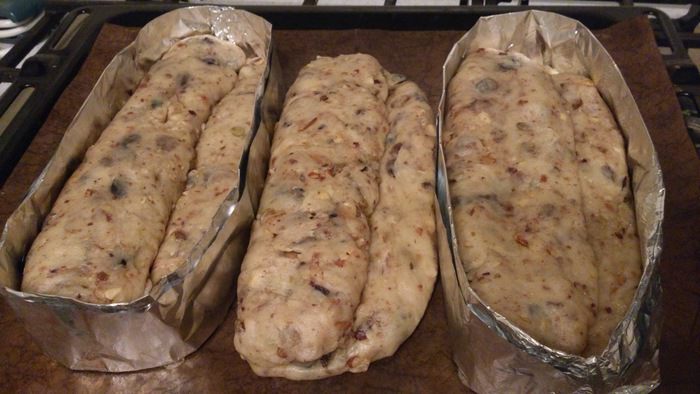 Застелить противень пергаментом. Выложить штоллены, чтобы во время выпечки они не растеклись можно сделать бортики из фольги. Накрыть полотенцем и поставить на ночь в холодильник. Я выносила на балкон.