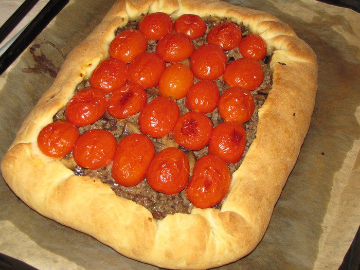 Помидоры черри разрезать пополам, выложить на открытый фарш срезом вниз. Смазать маслом тесто и помидоры.