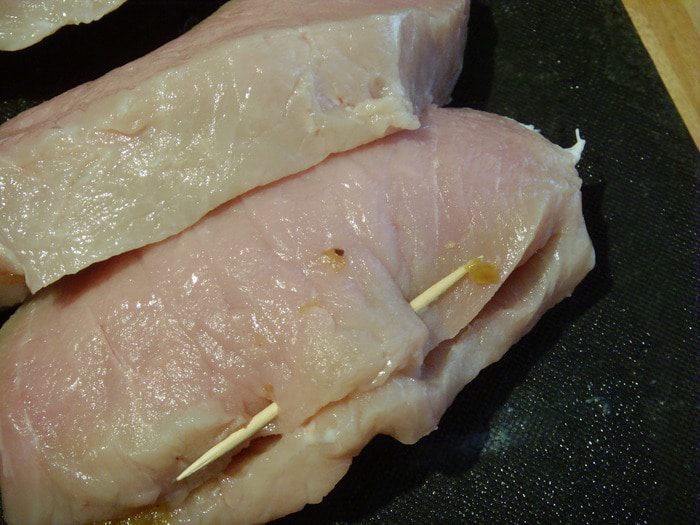 Корейку разрезать на порционные кусочки, острым ножом порезать кармашки и наполнить их чатни, закрепить зубочистками.