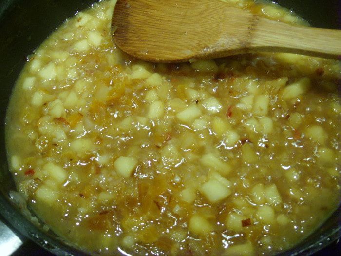 Затем яблоко, курагу, чили. Тушить на среднем огне, добавляем сахар, соль.