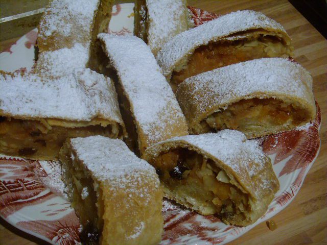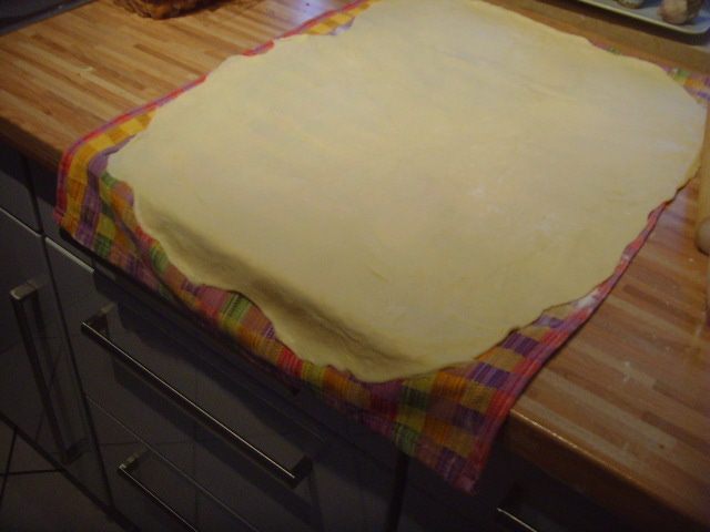 Тесто может находиться в холодильнике до тех пор, когда вы захотите с ним дальше работать. Я говорю это к тому, что штрудель очень вкусно есть в тёплом виде с ванильным соусом или шариком мороженого. За час до начала работы с тестом его нужно вынуть из холодильника. Кухонное полотенце посыпать мукой. Растопить масло, добавить в него ванильный экстракт. Тесто раскатать очень тонко, при необходимость его растягивает руками.