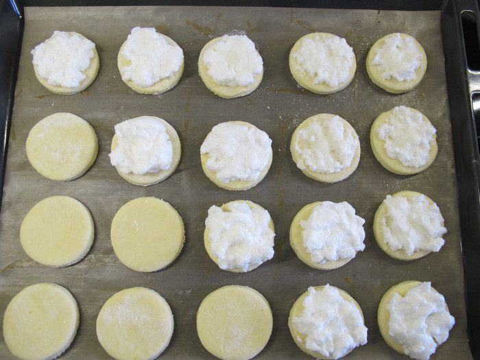 Стол припылить мукой. Раскатать тесто толщиной 5 мм, чашкой вырезать кружки и выложить их на противень. Коржики смазать взбитым белком, посыпать сахаром.
