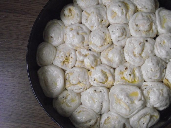 Просеять половину муки и замесить тесто, продолжая добавлять порциями оставшуюся часть муки. Для легкого замеса смазать руки оливковым маслом. Тесто замешиваем интенсивно, растягивая его и складывая в несколько слоев. Вмешиваем в тесто небольшими кусочками сливочное масло. Тесто должно получиться гладким, мягким и однородным. Смазать миску оливковым маслом и отправить в нее тесто, укутав пакетом. Тесто должно увеличиться в объеме в 2 раза.