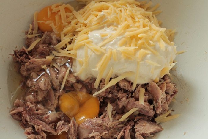 К тунцу добавить яйца,молоко,сметану,натертый на крупной терке кусочек сыра,у меня был голландский,вы можете выбрать по своему вкусу.Аккуратно перемешать.