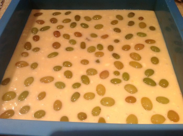 Перелейте тесто в форму для выпекания и положите в него виноградинки. Выпекайте в духовке около 45 минут.