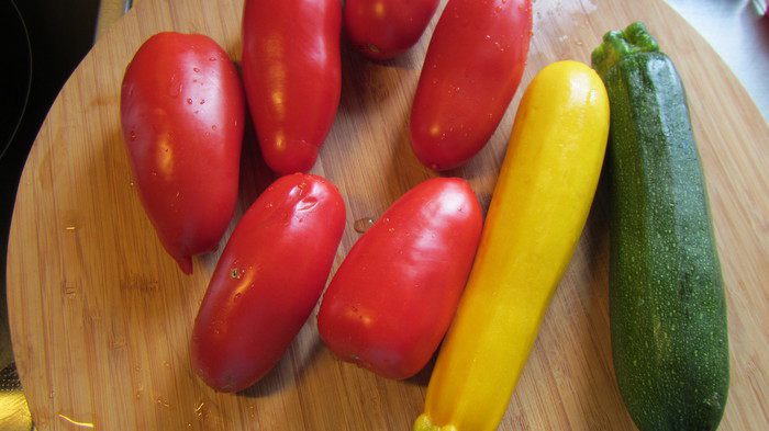 Нарезаем цукини и помидоры тонкими кружочками.