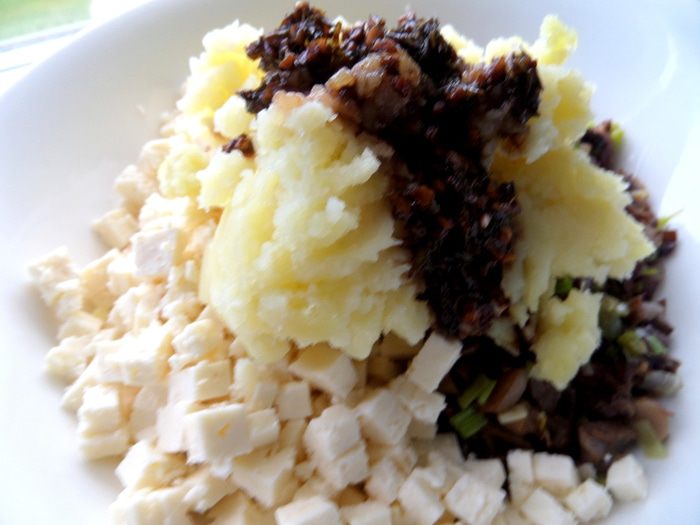 У меня осталось немного отварного картофеля,решила добавить для вкуса и объёма))) Разминаем картофель вилкой.