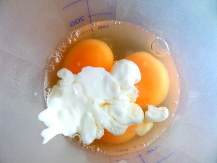 Для заливки смешиваем в шейкере яйца со сметаной и водой,чуть приправ или соли.