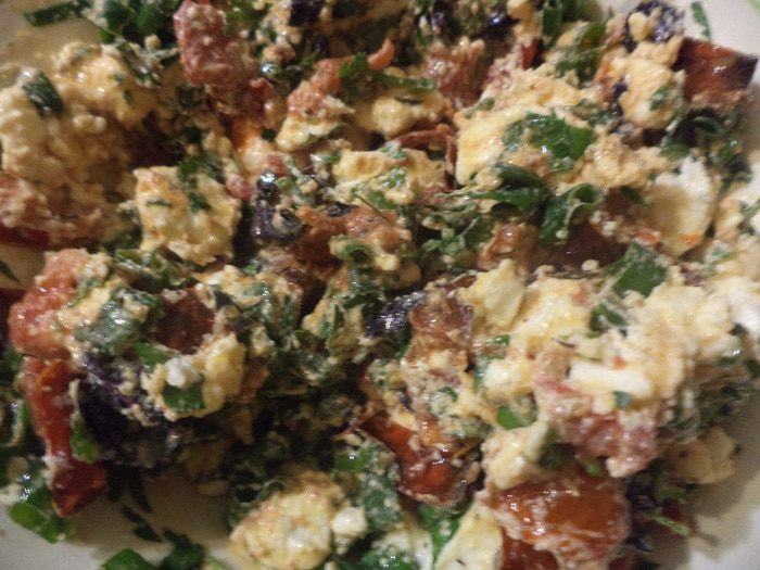 За это время готовим начинку. Вяленые помидоры мелко нарезать, фету раскрошить. Перемешать помидоры, фету, базилик, петрушку, зелёный лук, добавить оливковое масло, перемешать.