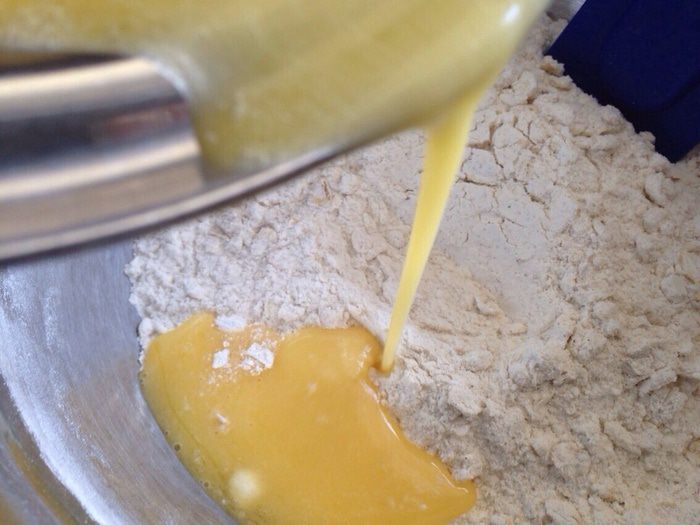 Растопить сливочное масло.Затем смешать со взбитым яйцом и молоком.И влить смесь в мучную часть.