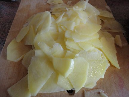 8. Выстелите бумагой для выпечки круглую разъемную форму, смажьте оставшимся сливочным маслом, высыпьте на нее миндаль и уложите слоями половину картофеля.