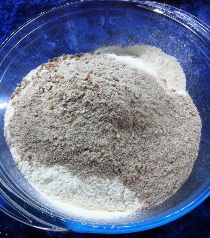 Муку, соль и разрыхлитель смешать. По рецепту необходима была пшеничная мука. К моему сожалению, у меня дома оказалось только 300 грамм, из 550 необходимых. Было уже слишком поздно бежать в магазин и я добавила 250 грамм смеси для выпечки ржанного хлеба, о чем потом не пожалела.