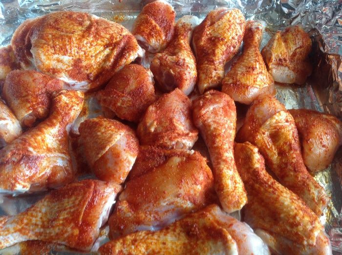 В этом рецепте, по просьбе моих мужчин, я использовала куриные ножки и бедра, общим весом 2,8 кг. Соль нужна крупного помола, стакан 250 мл.