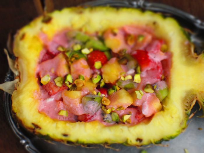 В ананас выложить фрукты,полить клубничным соусом и посыпать рубленными фисташками.Приятного аппетита:))