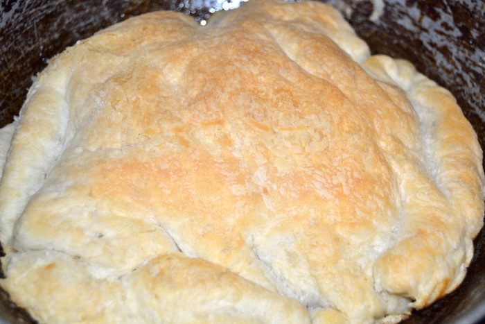 Тесто раскатать по размеру. Достать из духовки сковороду и накрыть баклажаны тестом, аккуратно подгибая края вниз.