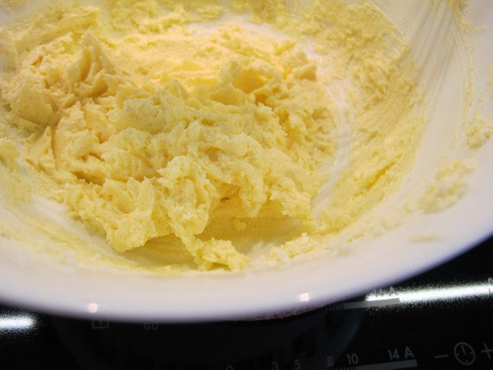 Маргарин комнатной температуры размять вилкой. Порциями подсыпая сахар тщательно взбить.