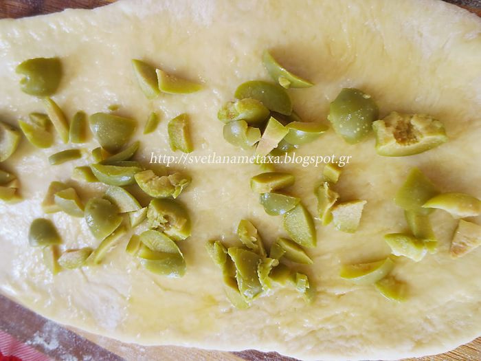 Для другого вида булочек, разрезаем оливки на небольшие кусочки. Лепешку смазываем маслом и выкладываем оливки.