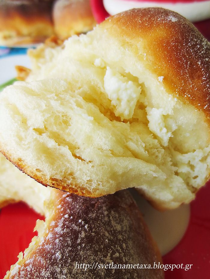 Остывшие булочки с творогом и без начинки, посыпаем сахарной пудрой.