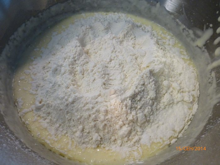 Смешиваем муку, разрыхлитель и соль. Просеиваем мучную смесь к тесту.