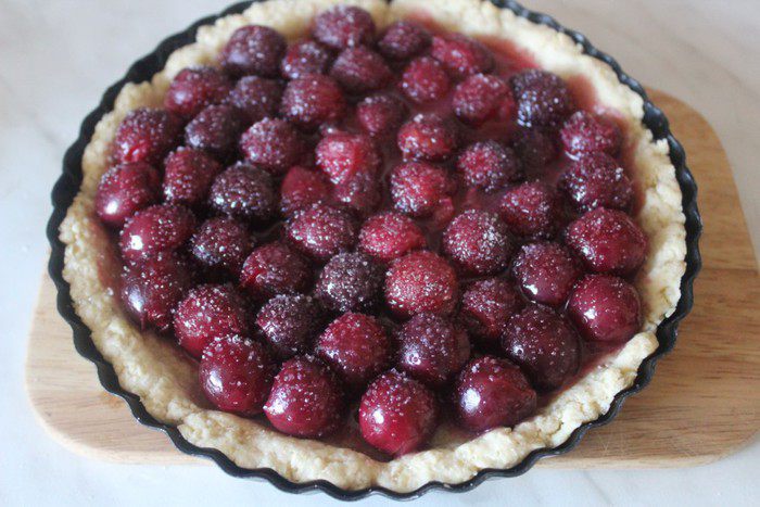 Для теста соединить два вида муки, разрыхлитель, сахар и соль. Смешать мучную смесь с холодным маслом до состояния крошки. Удобнее это сделать в комбайне или при помощи блендера. Добавить яйцо и сметану и замесить гладкое тесто. При необходимости добавить немного муки. Сформировать из теста шар, затянуть пищевой пленкой и охладить в течение 30 минут. Затем тесто раскатать, выложить в форму и отправить в холодильник еще на 30 минут.