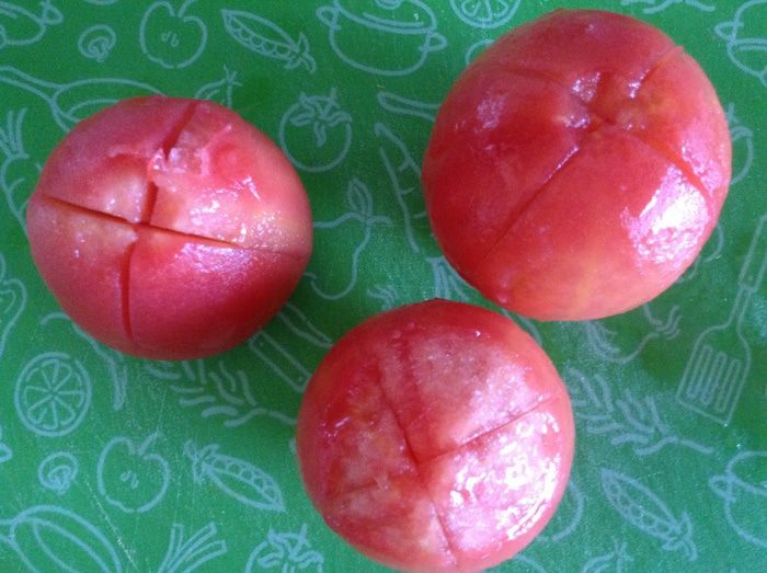 Помидоры залить кипятком, снять шкурку.