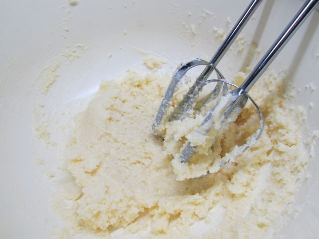 Размягчённое сливочное масло взбить с сахаром в белую массу.