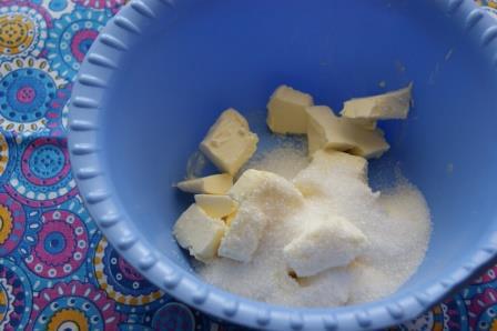 Готовим тесто. Холодное масло порубить на кусочки, смешать с сахаром.