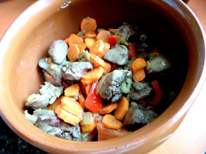 Печень в горшочке в сметанно-томатном соусе с овощами