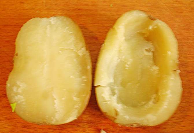 С готового картофеля слить воду, дать немного остыть. Разрезать картофель пополам. Вынуть серединку оставляя стеночки толщиной 5 - 10 мм. У нас получаются лодочки.