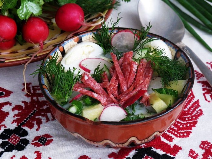 В отдельной посуде смешиваем йогурт,охлажденную воду в соотношении 2:1. Добавляем по вкусу уксус. Кладём нарезанные овощи, солим, хорошо перемешиваем. Разливаем окрошку по тарелкам, украшаем салями, вареным яйцом, зеленью. Добавляем несколько кубиков льда. И сразу подаём.