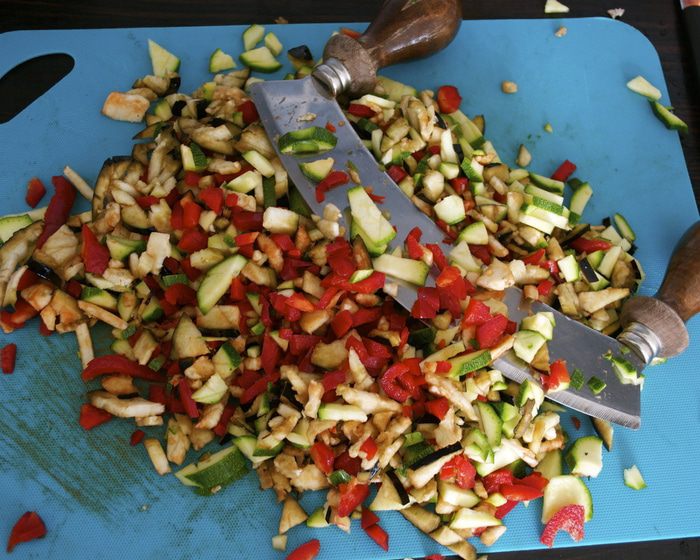 Затем собрать все овощи на большой доске и порубить, измельчить..., используя нож-полумесяц... Или обыкновенным крупным ножом! (Овощи при этом выдавали непередаваемый аромат свежести!!!)
