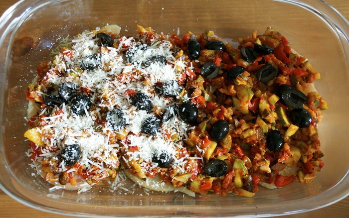 Выложить маслины и присыпать тертым острым сыром (у меня пармезан)... Поставить запекаться в разогретую духовку на 20 минут.