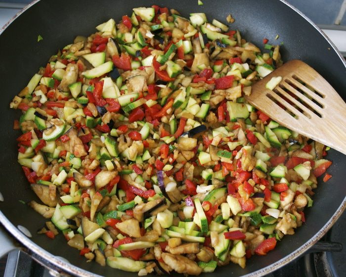В большой сковороде разогреть оставшиеся 2 ст.л. оливкового масла и выложить овощи. Обжаривать, помешивая 2 минуты.
