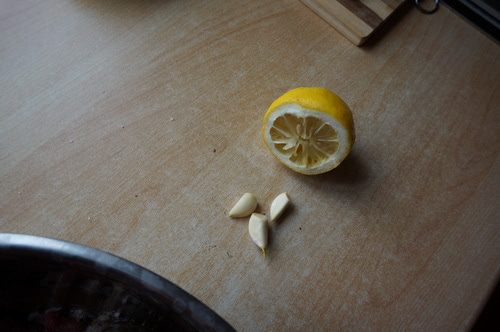 Чеснок измельчить, добавить в филе. Лимон выдавить в филе. Посолить, поперчить. Оставить мариноваться на 20 минут.