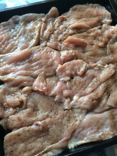Отбиваем филе и смазываем солью и перчиком с обеих сторон. Выкладываем в один слой на противень.