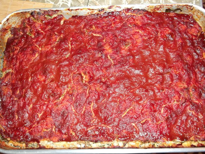Сверху выкладываем оставшийся фарш, хорошо перемешиваем томатный соус с горчицей и равномерным слоем смазываем запеканку.