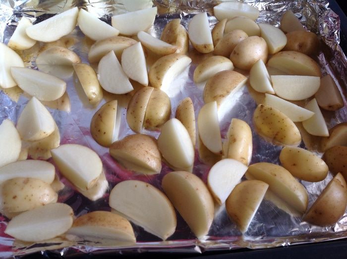 Духовку нагреть до 180 градусов. Картофель вымыть щеткой, разрезать на 4 части, выложить в глубокий противень застеленный фольгой.