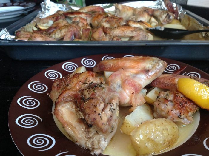 Курицу можно использовать любые части или даже запекать целиком. У меня сегодня бедра и крылья. Тимьян можно использовать свежий, тогда понадобится 4-5 веточек и также как у розмарина только листья.