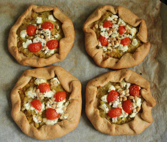Мини-галеты из цельнозерновой муки с луком-пореем, козьим сыром и кедровыми орехами