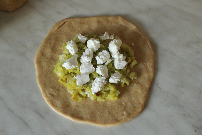 На раскатанную лепешку выложить слегка обжаренный порей.